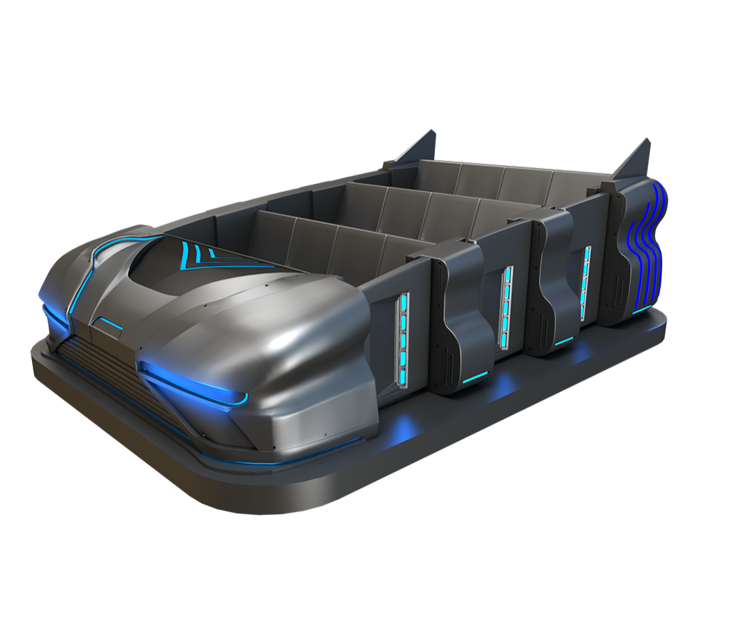 車體設計上,車輛結構輕巧、緊湊(承載人數12人/車),行走軌跡可隨意設定,且轉彎半徑小,可實現直角轉彎;車輛外觀富有科技感的配色及戰船造型,搭配炫彩的科技藍燈帶,貼合項目主題,營造滿滿的沉浸式科技氛圍。
