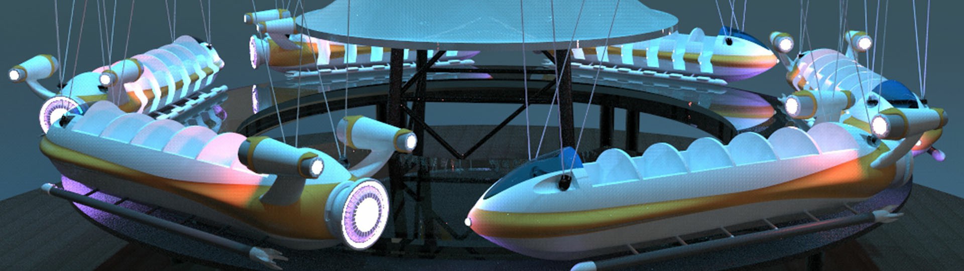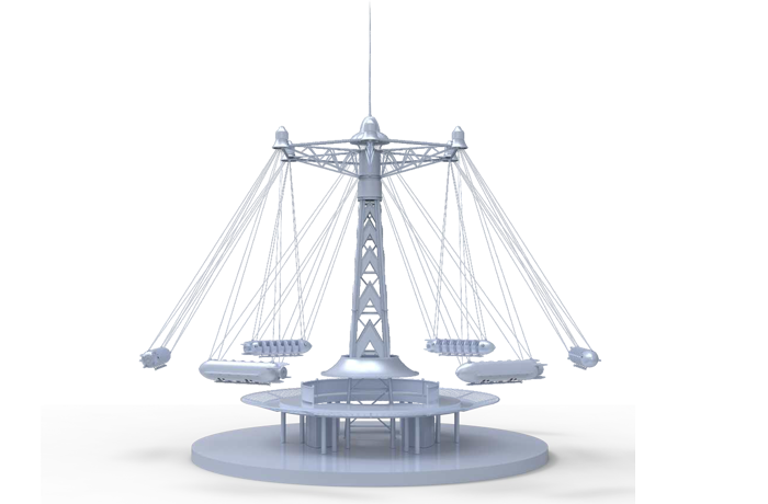 幻速追影六個飛機吊掛座艙隨同旋轉(zhuǎn)架相對塔體自由旋轉(zhuǎn)并外擺升起,繞中心立柱飛行,科幻又刺激。夜間智能燈光系統(tǒng)亮起,成為樂園一道的奇趣風景線。