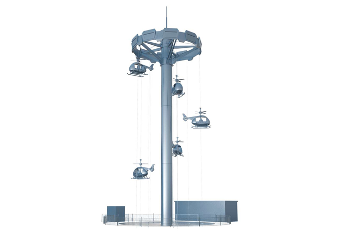 以中國?助研制直-5直升機為設計靈感,模仿直升機運??式制作的?款游樂設備。直升機的座艙外形,配備軍裝迷彩的配?;打破傳統新穎的背靠背的乘坐?式,觀景視野更開闊。運?時,乘客猶如在直升機中,時?升?頂端,時?上下起伏,頂上和尾翼的旋翼會隨上升下降?配合轉動。